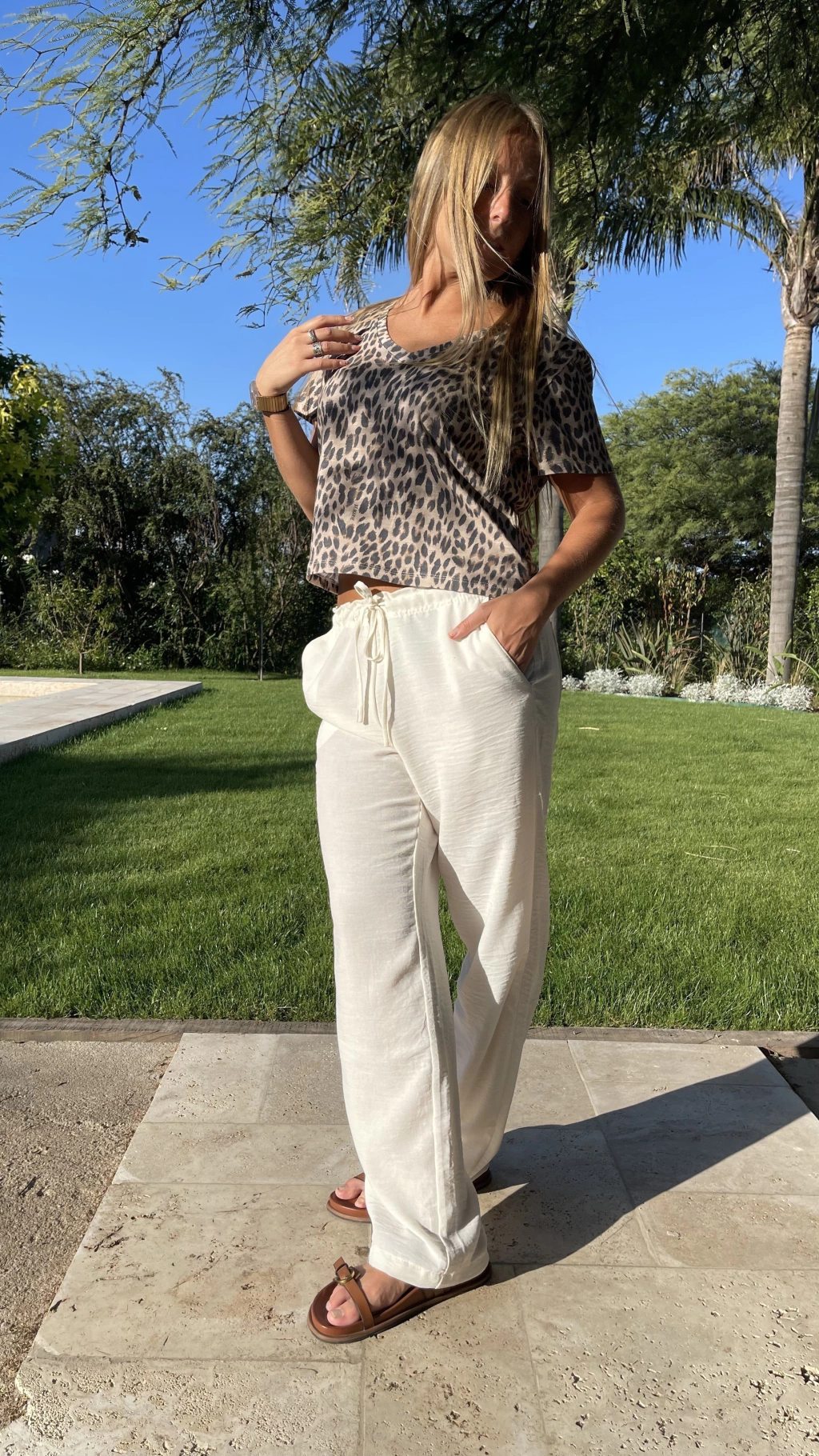Te presentamos este Pantalon, es de lino. La cintura se ajusta con un cordon.