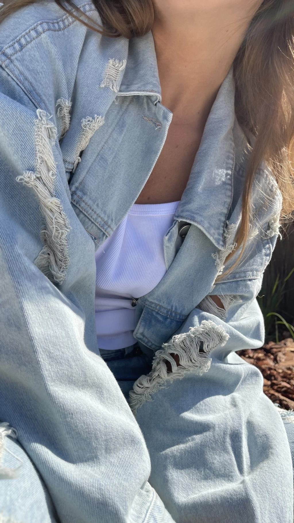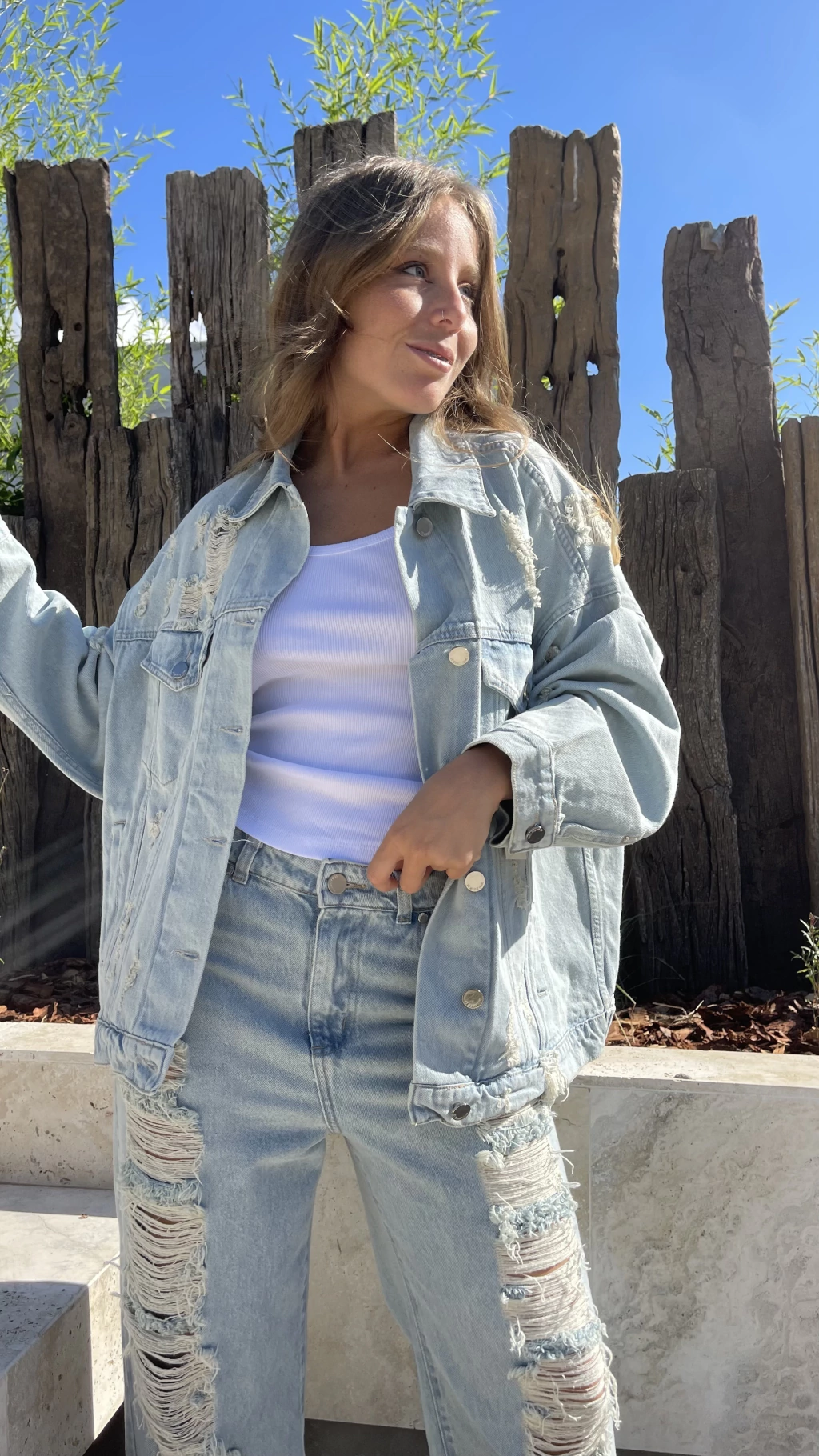 Descubre la Campera York, una prenda esencial para quienes buscan estilo y confort. Esta campera de jean oversize larga presenta un lavado celeste bleach matizado con roturas, que la convierte en una opción moderna y versátil.
