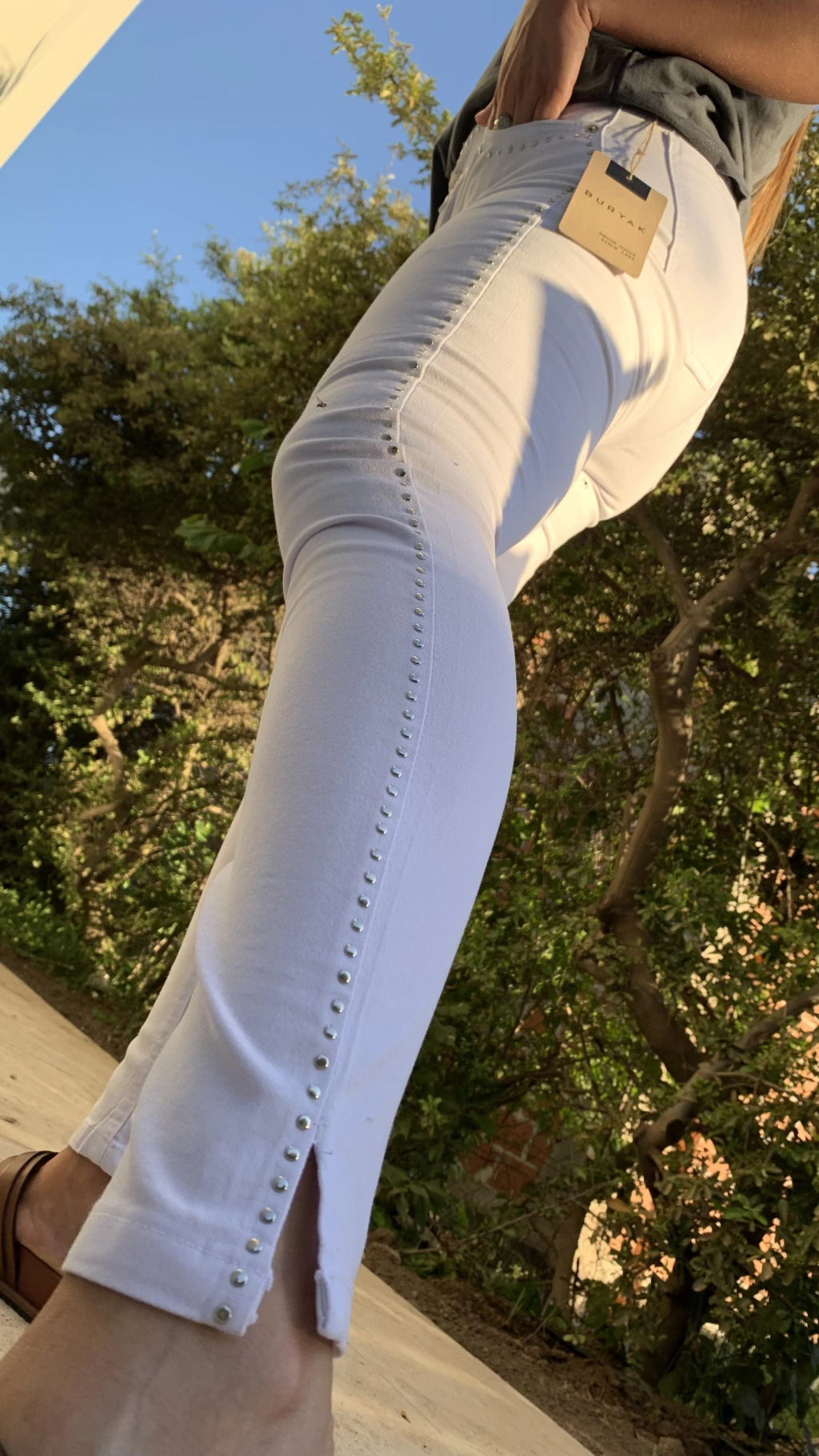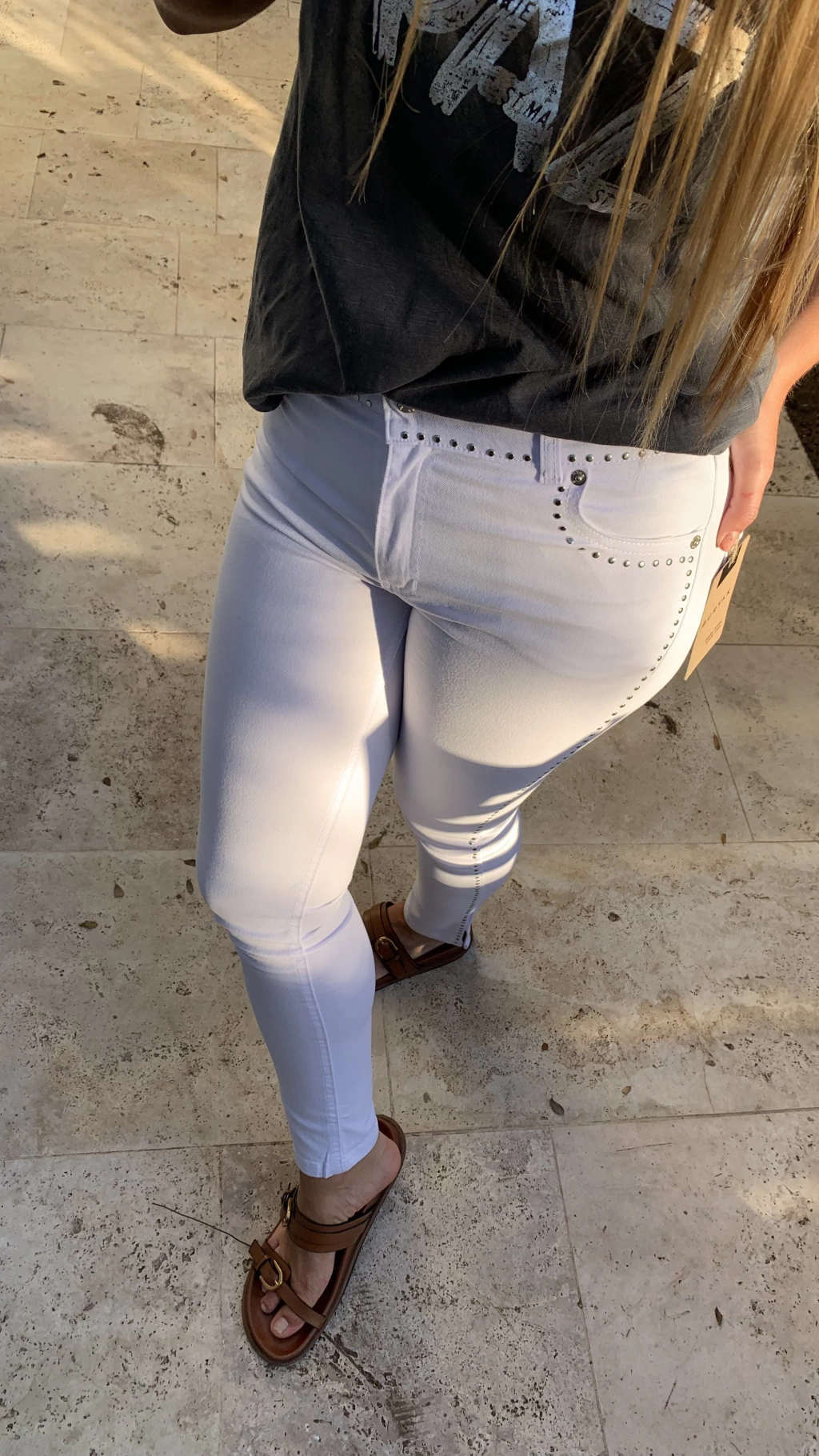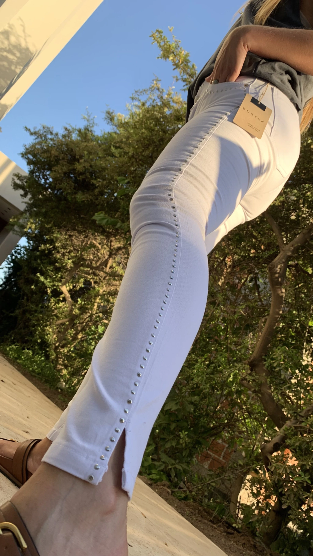 El color blanco le da un aire fresco y versátil, lo que lo convierte en una excelente opción para diversas ocasiones. Puedes combinarlo con camisetas, blusas, o incluso con una chaqueta para un look más sofisticado. Además, es perfecto para la temporada de primavera y verano, pero también se puede usar en otoño e invierno con capas adecuadas. Tiene Tachas.