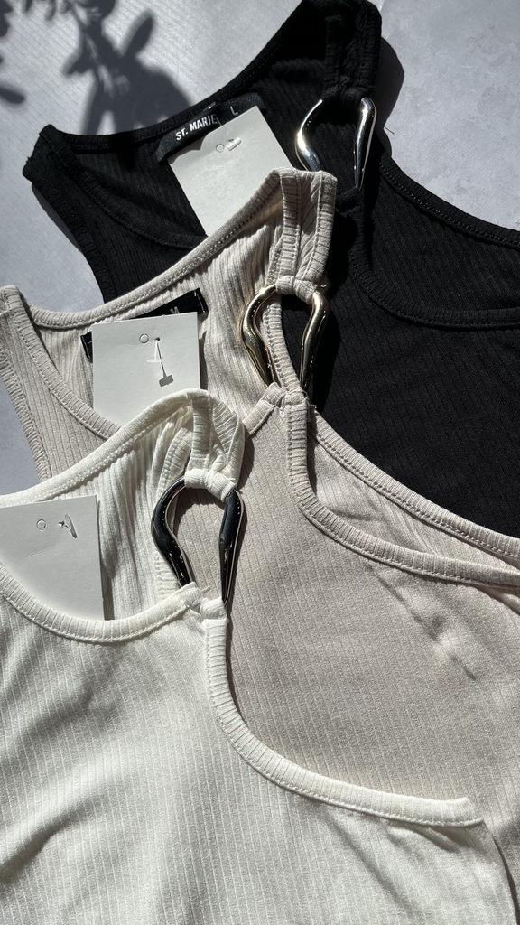 Descubre la Musculosa Daca, una prenda única que combina estilo y comodidad. Con un escote halter irregular y un detalle de herraje en el hombro, esta musculosa es perfecta para realzar tu silueta y añadir un toque moderno a tu outfit.