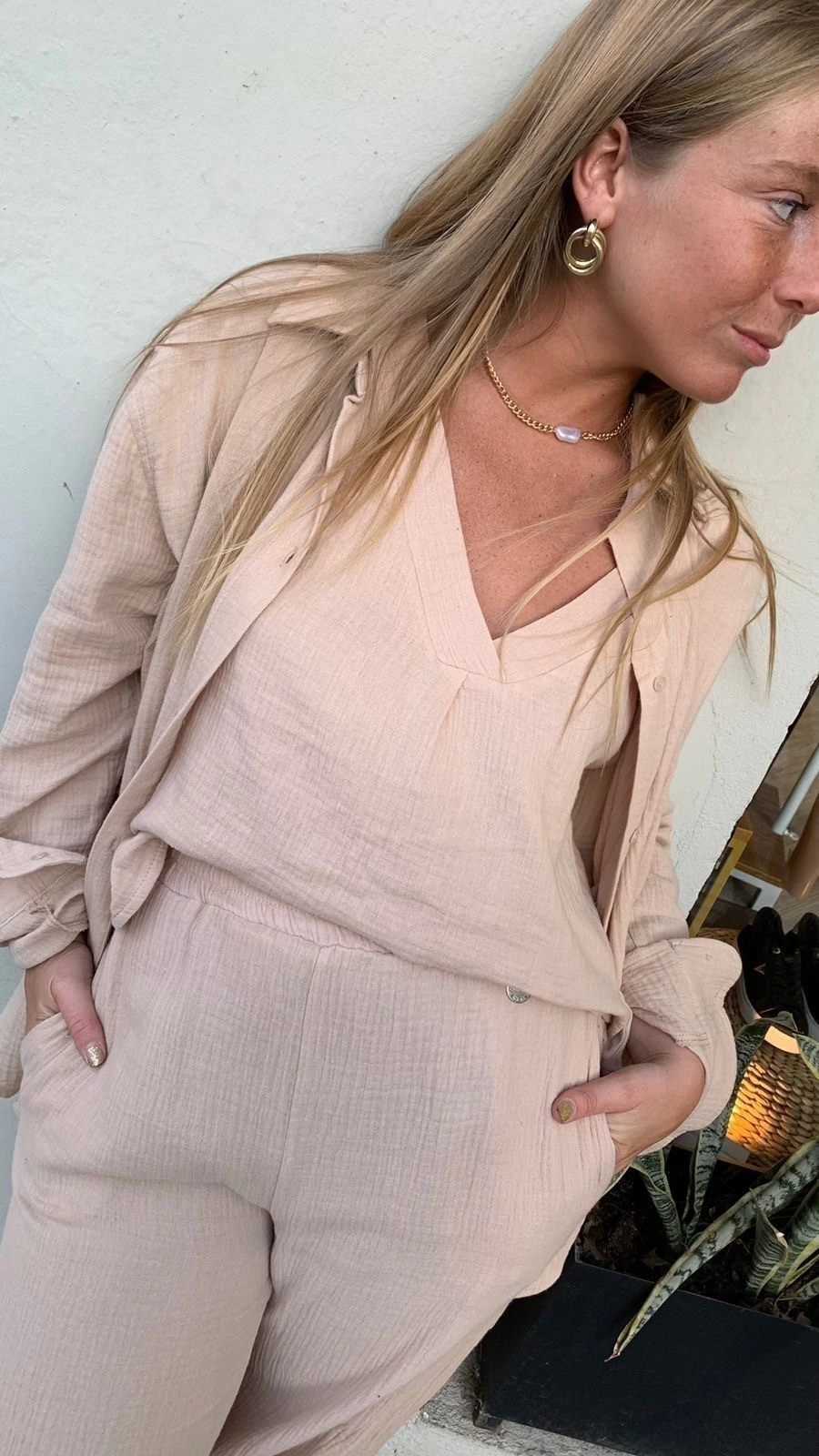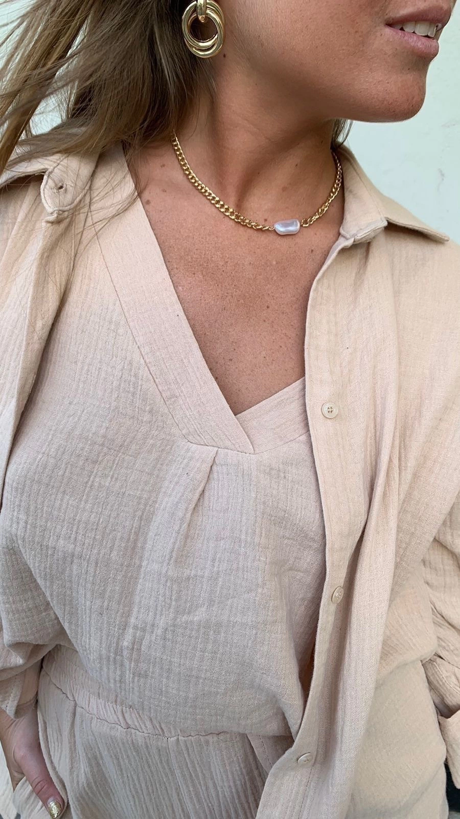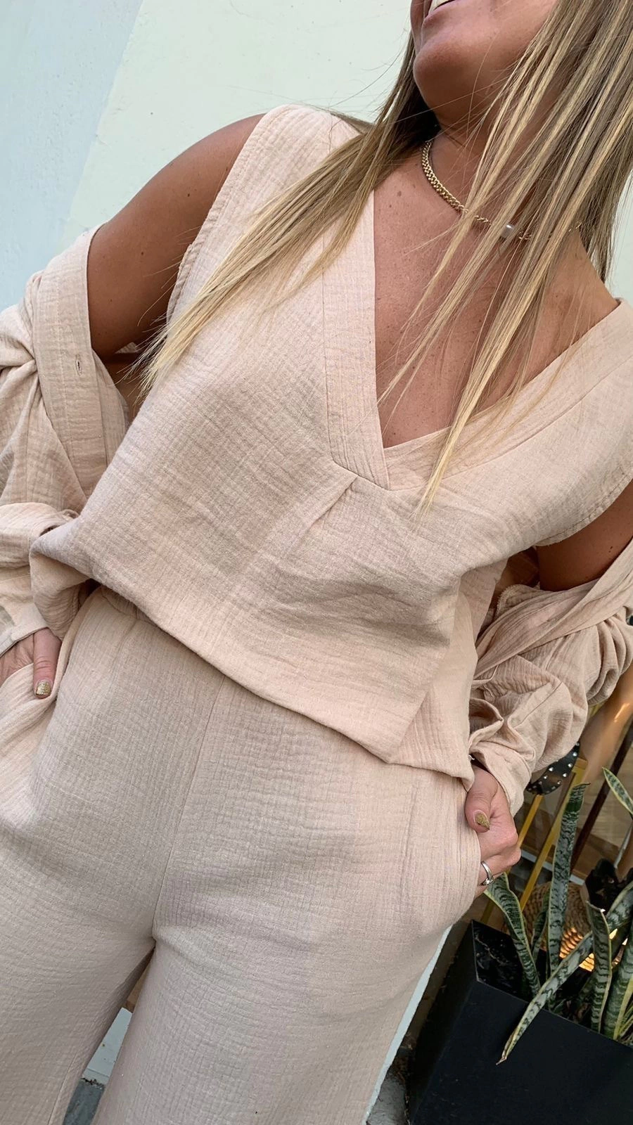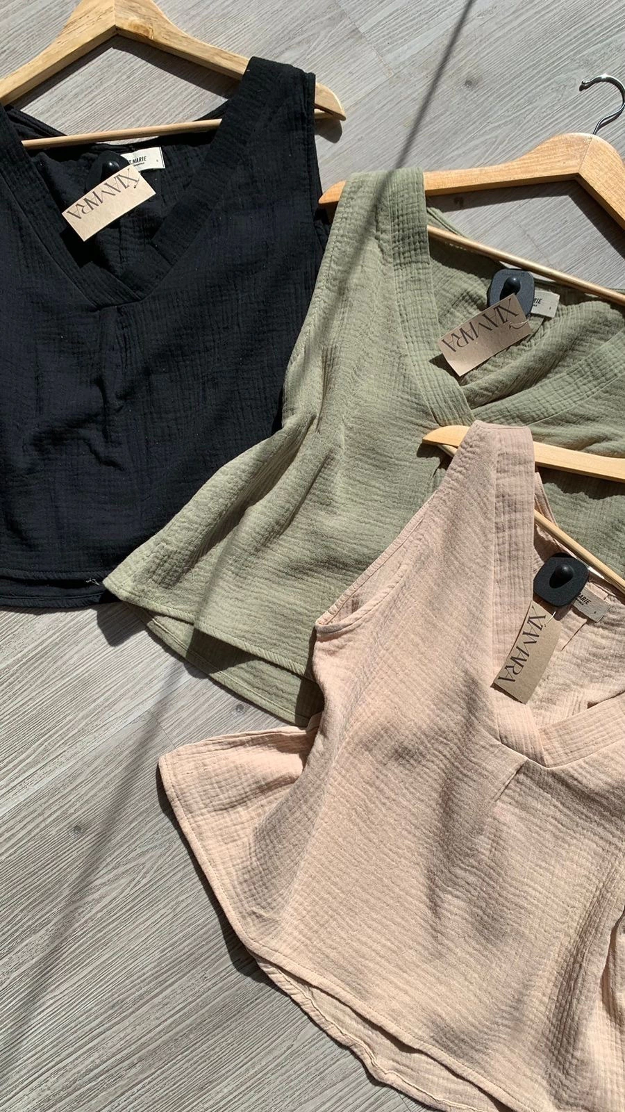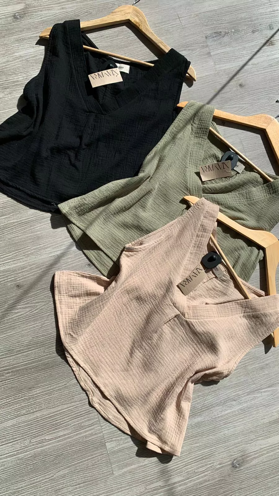Descubre la Musculosa Greek, una prenda que combina comodidad, frescura y estilo. Confeccionada en gasa arrugada, su corte suelto permite una excelente movilidad, ideal para los días cálidos.