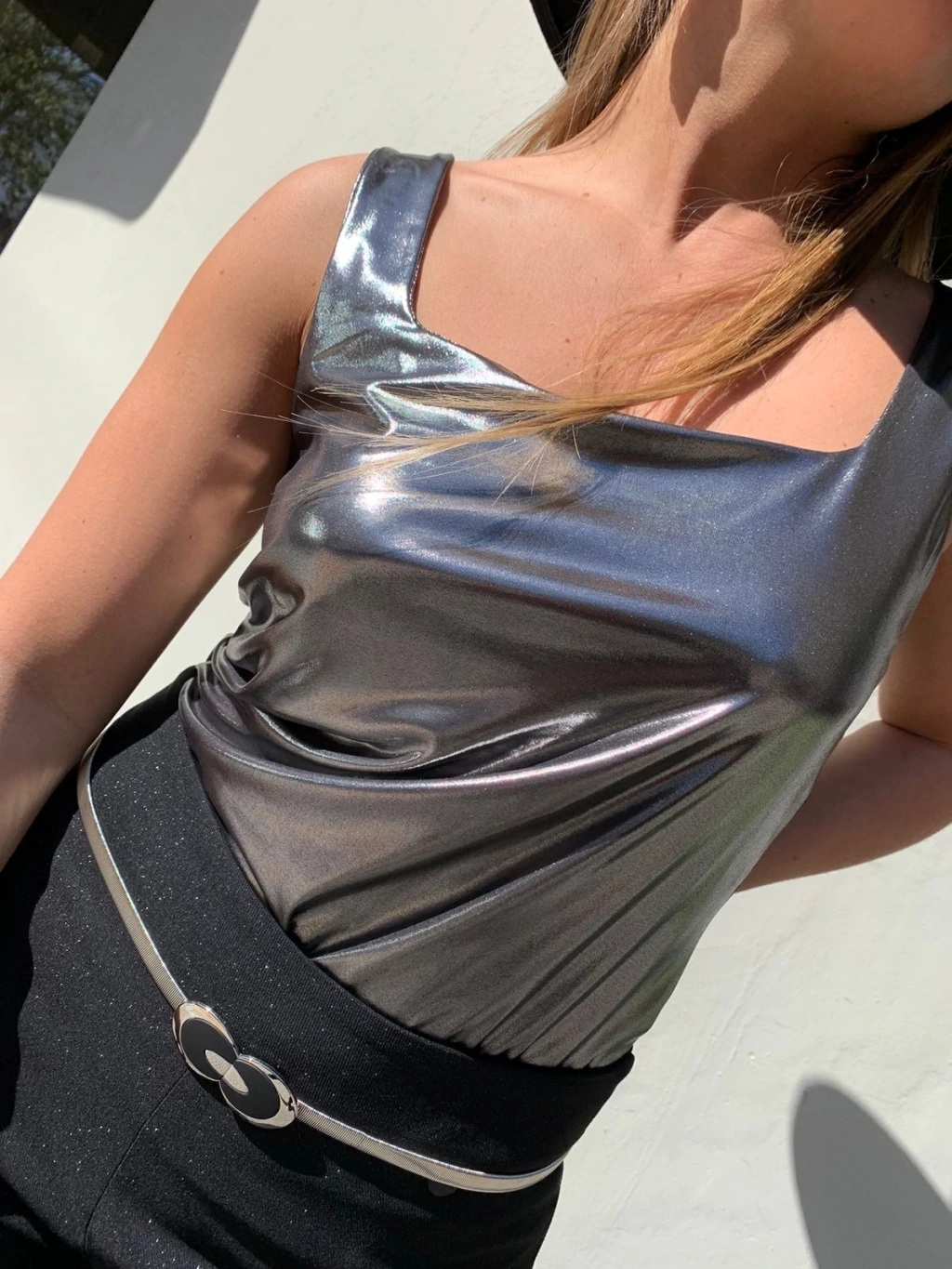 Te presentamos la Musculosa Cane, una prenda ideal para tus eventos especiales. Esta musculosa de fiesta destaca por su brillo en colores negro y silver, que aportan un toque sofisticado y elegante a tu look.