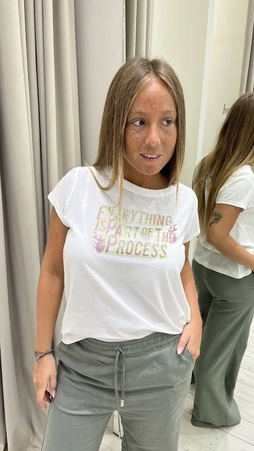 Descubrí la Remera Amancia, una prenda que combina comodidad y estilo único. Confeccionada en 100% algodón jersey, ofrece una textura suave y fresca ideal para el día a día. Su diseño estampado se realza con un detalle de hotfix, que aporta un toque de brillo y distinción.
